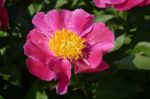 (William Krekler – Roy G. Klehm) Молочноцветковый (lactiflora). Полумахровый, темно-розово-фуксиновый с легким высветлением по краям лепестков и задорным желтым помпончиком в центре цветка. Стебли прочные. Ароматный. Среднего срока цветения. Очень яркий в саду.