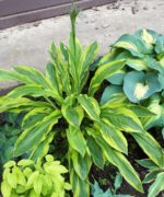 Foxfire Palm Sunday (Stephen Schulte 2009) М Средняя хоста с бледно-лавандовыми цветами. Длинные листья с пальмово-зеленым рисунком в центре и широким нерегулярным желтым краем. Растет в полутени/полной тени. Лист 30х15 см. Размер куста 35х70 см. Прирост от среднего до медленного.