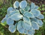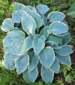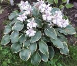Frosted Dimples (Don Dean 1999) M Cредняя хоста c бледно-лавандовыми цветами. Листья сине-зеленые цвета с неправильной желтизной, переходящей в кремово-белый край. Растет в полутени/тени. Размер куста 35х80 см. Прирост средний.