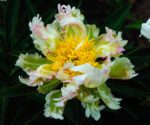(Krekler-Klehm, 1995, США) Полумахровый, кактусовидный. Цветок диаметром 16 см. Похож на кактусовидный георгин. Лепестки хорошей текстуры, белые с бледно-зелёными полосами и нежно-розовыми краями. В центре контрастные жёлтые тычинки. Аромат лёгкий, приятный. Куст компактный. Высота 50-60 см. Цветение обильное, в ранние сроки. Прекрасно подходит для срезки.