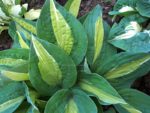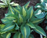 (Danny Van Eechaute, 2011) L Листья крупной хосты “Горячий поцелуй” имеют латунно-золотую серединку, окруженную пудрово-голубой каймой. Кроме того белая линия окружает центр листа. Лист немного рифленый, немного волнистый, немного гофрированный. Цветы лавандового цвета. Растет в полутени/полной тени. Лист 16×9 см. Размер куста 45×75 см. Рост быстрый или средний.