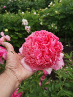 Травянистый гибрид. Махровый бомбовидный. Ранний. Цветок крупный диаметром 17 см. Куст высотой 85 см. Лососево-розовый. Во время цветения края светлеют, а центр остается ярким. Стебли прочные, но без подвязки имеют тенденцию к изгибанию. Очень эффектный сорт. Редкий Нарастает очень медленно. Цвет меняется от глубокого розового до оранжево-розового.