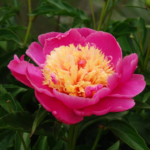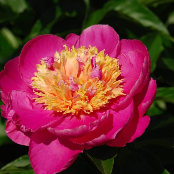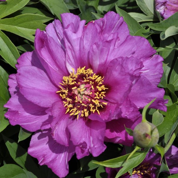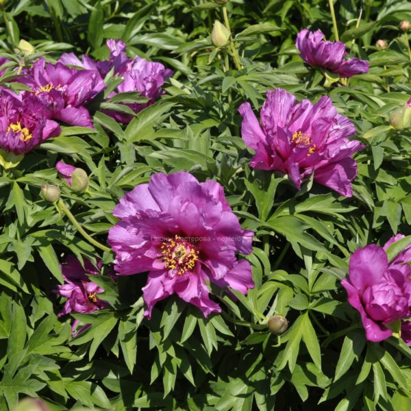 Morning Lilac (Р. Андерсон, 1999, США.) ИТО-гибрид. Лепестки цвета яркой фуксии украшают многочисленные тончайшие темно-фиолетовые линии и штрихи, стекающиеся к центру с пушистым пучком золотых тычинок. Незабываемые огромные цвет-ки обладают легким ароматом. В группе ИТО-пионов расцветает одним из первых, цветет долго и обильно. Быстро формирует компактный плотный куст.