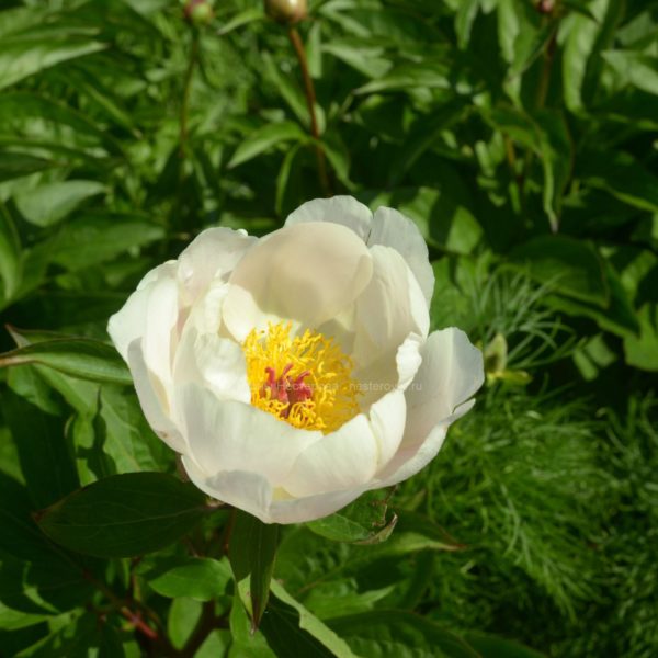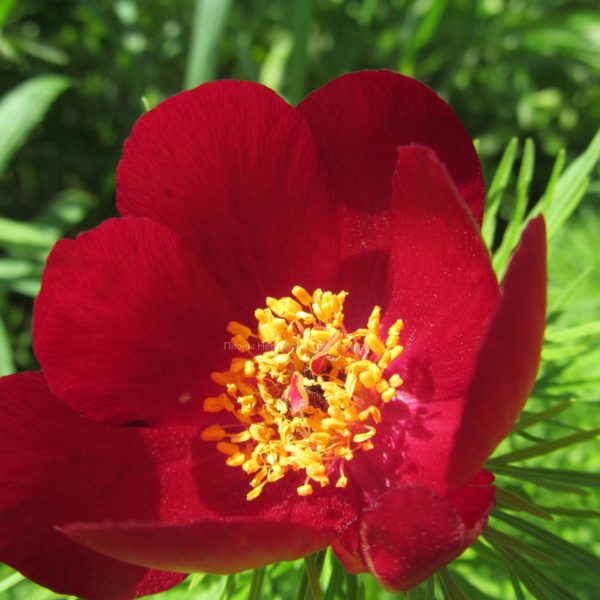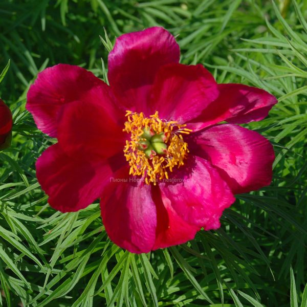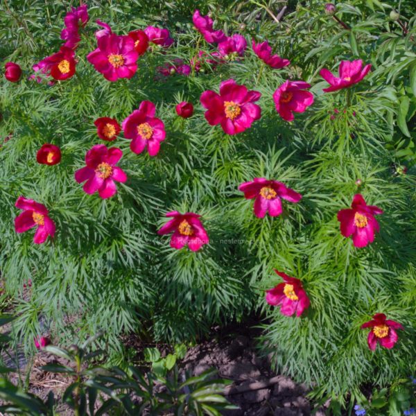 Paeónia anómala. Пион уклоняющийся. Другое название Марьин корень. Видовой пион. В отличии от многих пионов цветки смотрят в сторону. Цвет красно-пурпурный. Форма цветка простая. Декоративный куст полушаровидной формы, хорошо смотрится и после цветения. Диаметр 10 см. Высота 50 см. Срок цветения очень ранний. Листья узкие, дважды тройчатые, темно-оливково-зеленые. На стебле по одному цветку. Исключительно неприхотливый. Цветет, как в тенистых, так и на освещенных ярким солнцем участках сада.