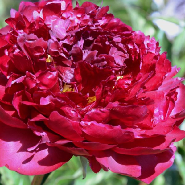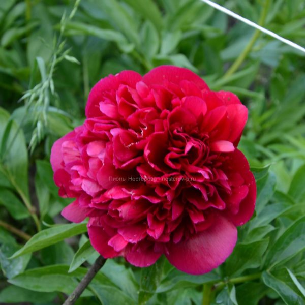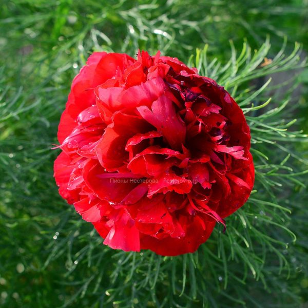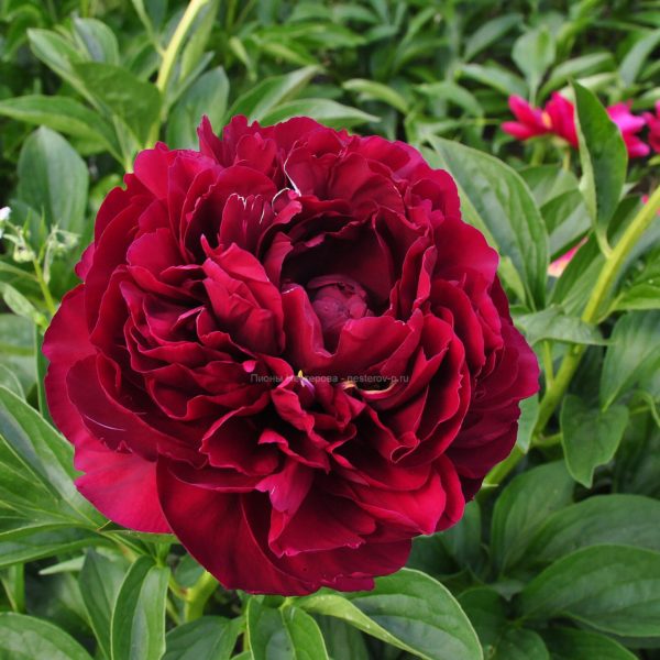 Махровый полушаровидный – махровый бомбовидный. Диаметр цветка 14 см. Рубиновый, края со временем светлеют. Пионы высотой 60 см. Срок цветения очень ранний.