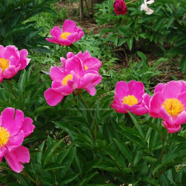 Nymphe (Дессер, 1913) Японский. Цветок чашевидной формы кораллово-розового цвета. В центре яркие жёлтые тычинки. Цветение обильное. Аромат приятный. Срок цветения средний. Диаметр 15 см. Высота до 90 см. Сорт отлично смотрится как в групповой посадке, так и в одиночной.