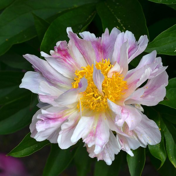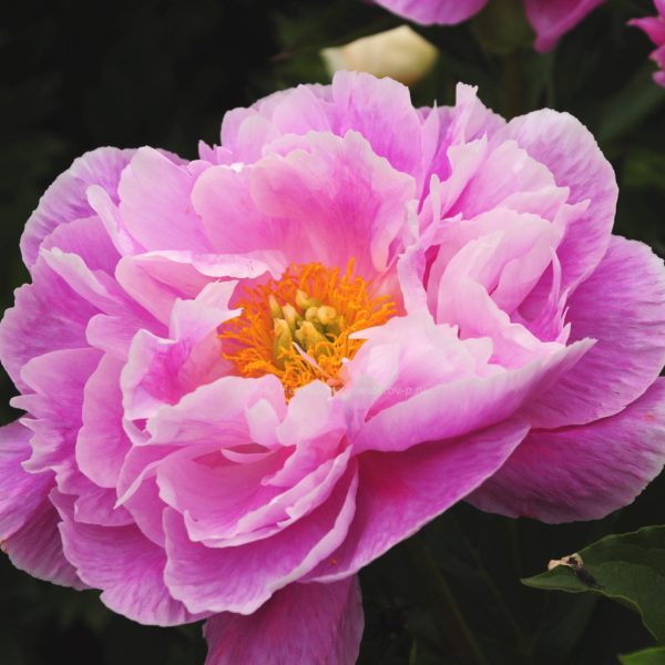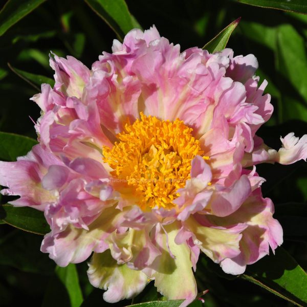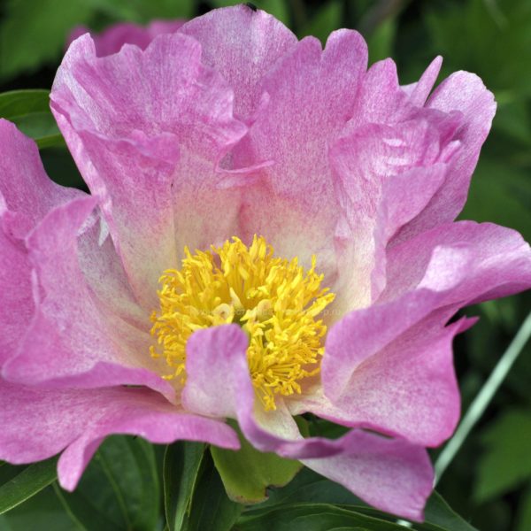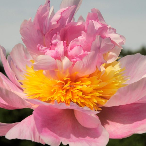 Форма цветка очень интересна. Ряд крупных розовых лепестков переходит в шар из кремово-желтых стаминодий, над шаром гофрированные лепестки основного тона.
