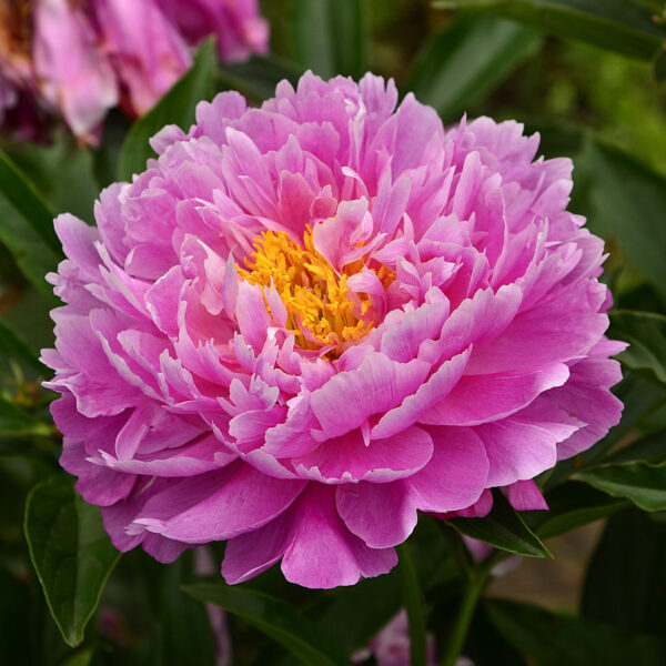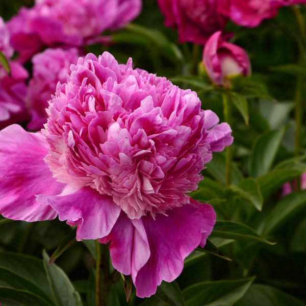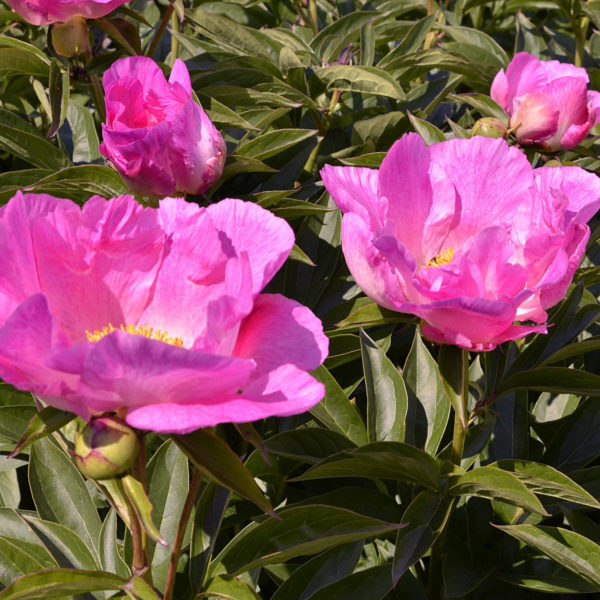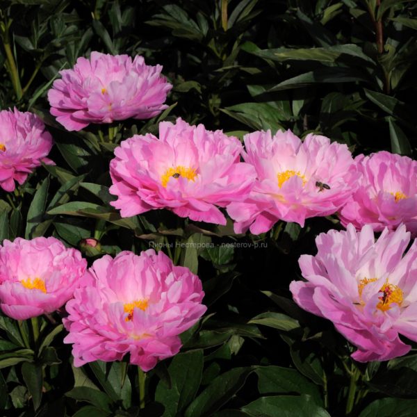 Pink Jazz (Клемм, 1958) Махровый. Плотные, закрученные лепестки. Сверкающий розово-красный. Стебли прямые, сильные. Цветение пионов очень обильное. Диаметр 16 см. Высота 70 см.