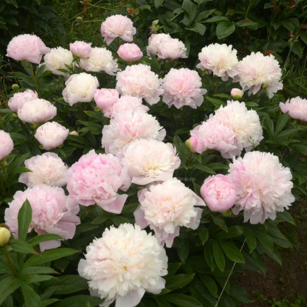 Pillow Talk (C. G. Klehm, 1973) Травянистый. Махровый, розовидный. Цветок крупный, пушистый, изящной формы, цвета розовой с перламутром камеи. Диаметр 20-25 см! Цветы, сидящие на высоких стеблях над зеленой листвой, смотрятся великолепно. Высота 70-90 см. Широко используется на цветочном рынке. Ароматный. Срок цветения середина сезона.