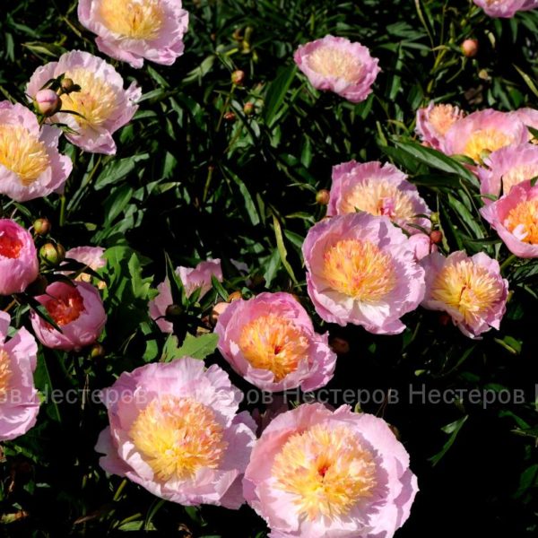 Zolushka (Скакодуб л 2013) Махровый розовидный. Центральные и внешние лепестки нежно розовые Корона из желтых стаминодий . Стебли толстые Средне поздний. Запах слабый