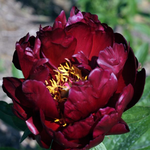 (Горобец В.Ф.1982) Размер цветка 18 см. Высота куста 90 см. Межвидовой гибрид. Простой формы. Темно-вишнево-красный. Аромат слабый. Очень ранний срок цветения.