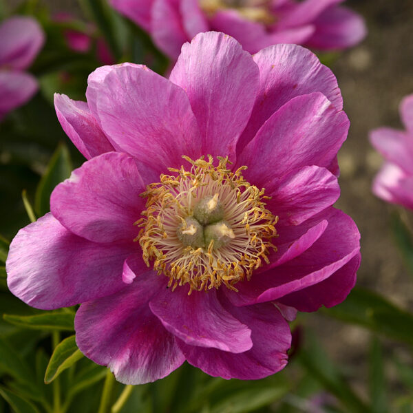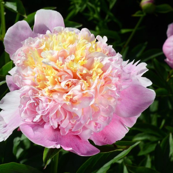 (Скакодуб, 2014) Фантазия – пион с внешними розовыми лепестками. Стаминодии розовые и желтые. Стебель крепкий.