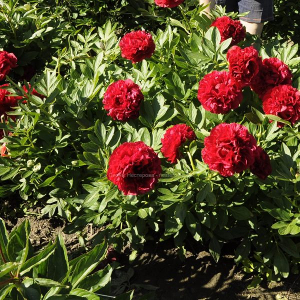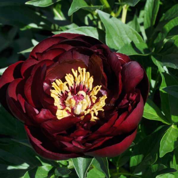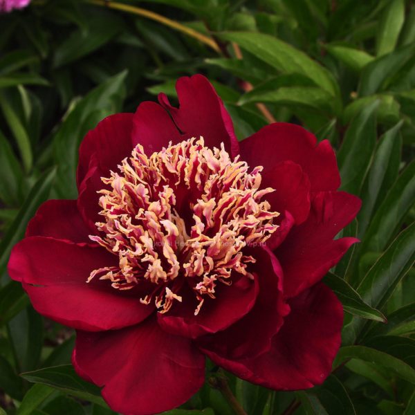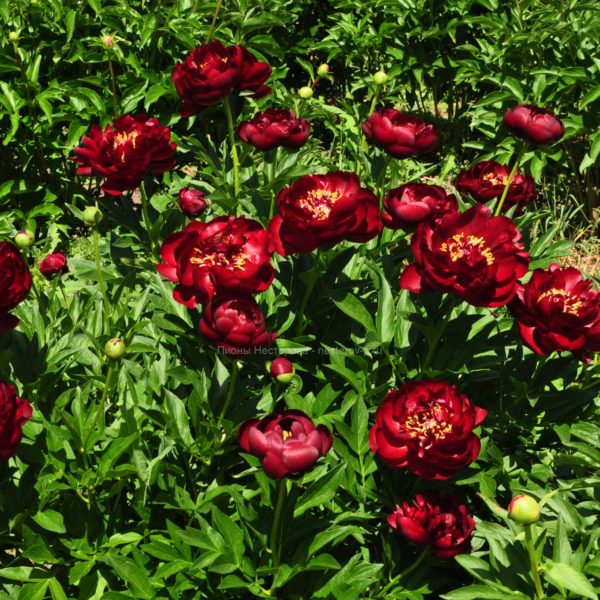 Charles Burgess (Креклер, 1963) Темно-красный. Стаминодии красно-розовые с желтыми кончиками. Пионы высотой 80 см. Срок цветения поздний.