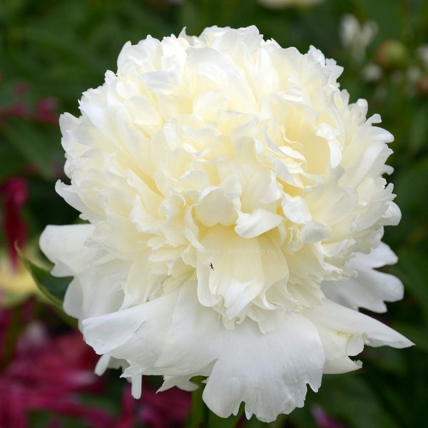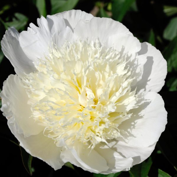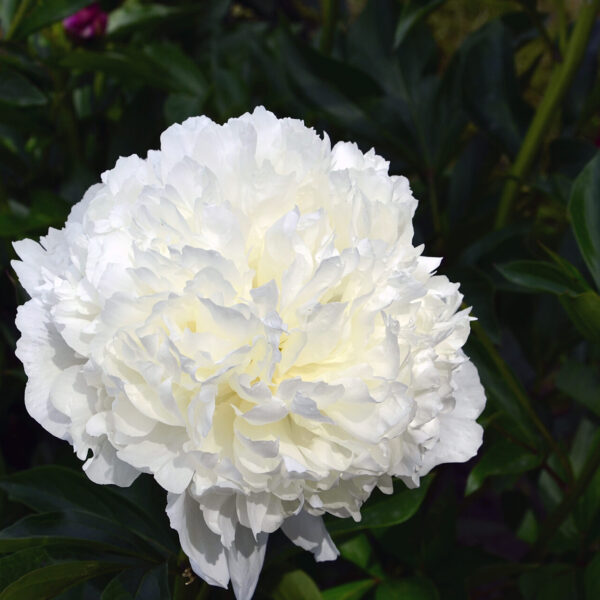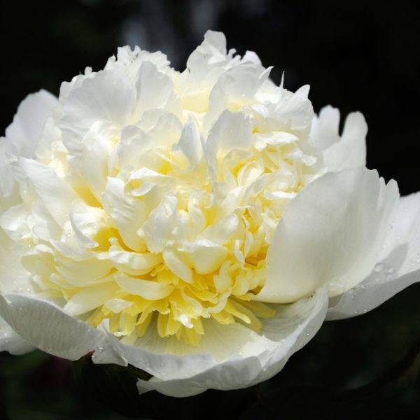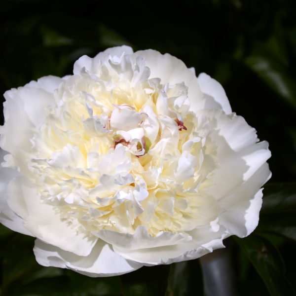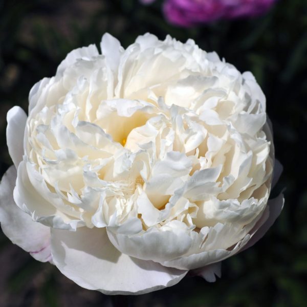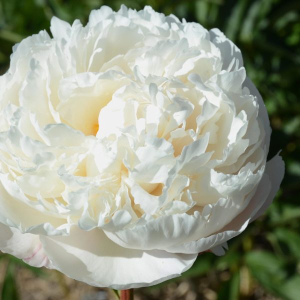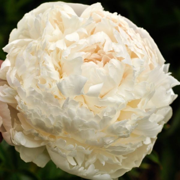 Махровый шаровидный. Цветок изящной формы, огромный, с закручивающимися лепестками, белый с оттенками жёлтого. Ранний. Высота 120 см. Классический белый пион для срезки. Аромат лёгкий.