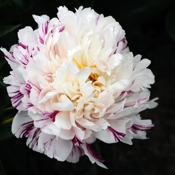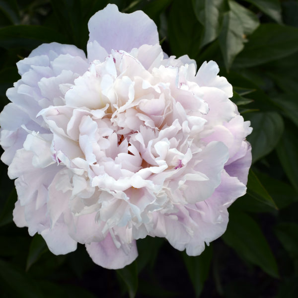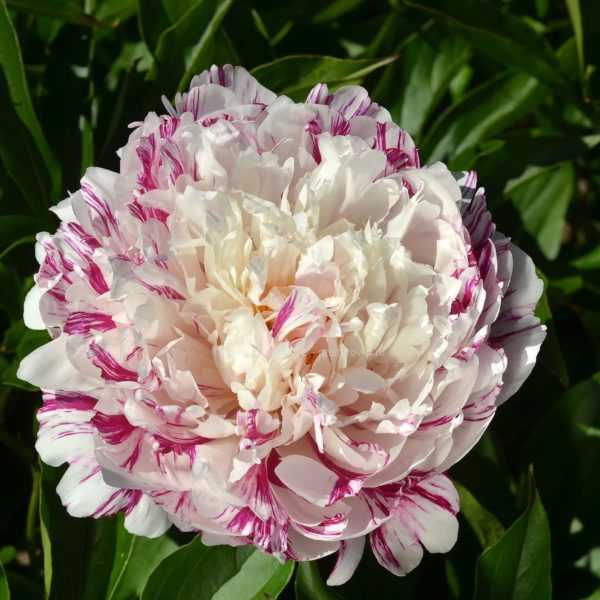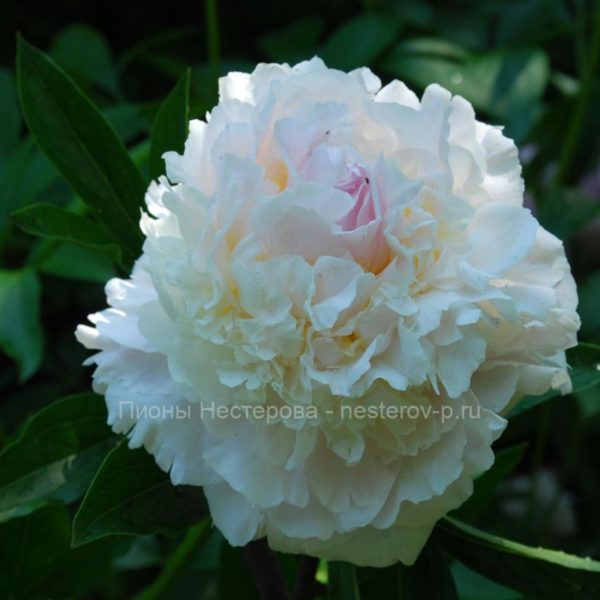 Средний срок цветения. Диаметр цветка 16см, высота куста 75см. Межвидовый гибрид Махровый розовидный – бомбовидный. Чисто белый,с легкой розовинкой при роспуске, бутоны с красными штрихами. Ароматный. Куст компактный. Стебли прямые, крепкие.