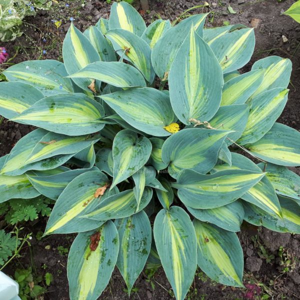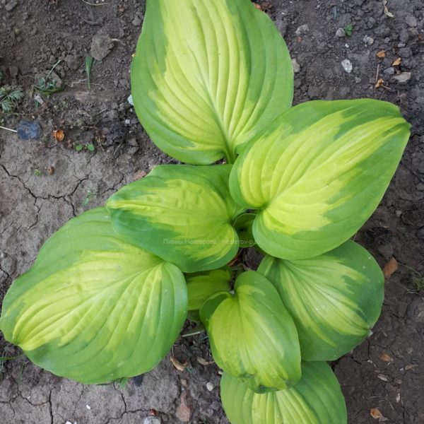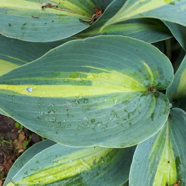 Catherine (Gerard Heemskerk 2011) M Средняя хоста с лавандовыми цветами. Листья сердцевидные нежно-желтые, с широким синим краем. Лист 15х10 см. Размер куста 40х70 см. Растет в полутени/тени. Прирост средний.