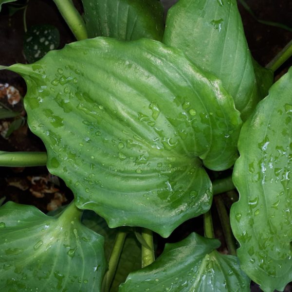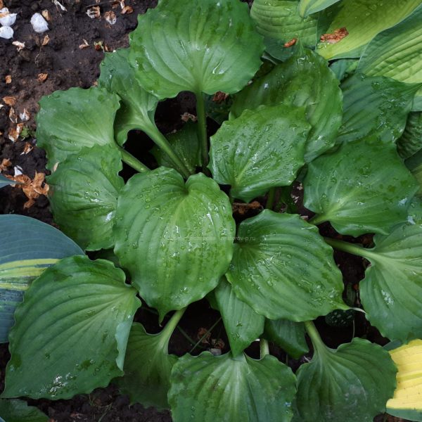 (Alex Summers/Arthur Wrede, 2003) М Средняя хоста “Конфетница” имеет лавандовые цветы. Листья очень толстые, темно-зеленые, блестящие с сильно гофрированным краем на красных черешках. Лист 13×10 см. Растет на солнце/в тени. Высота 35 см. Рост средний.